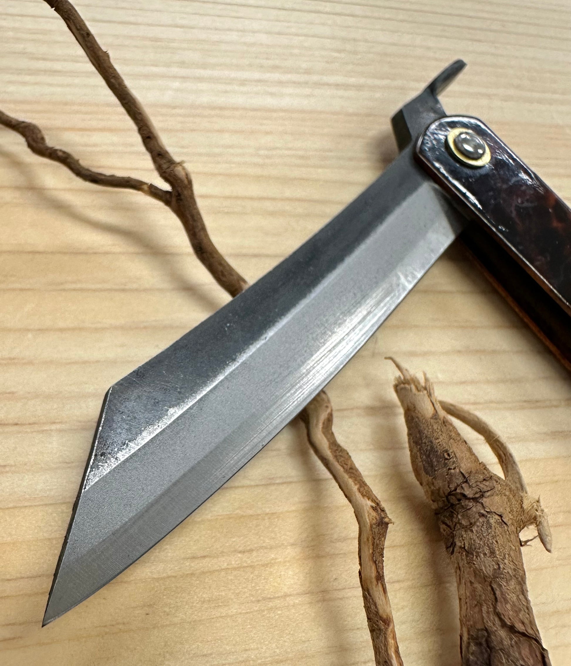 Outil d'atelier japonais traditionnel, ce couteau de charpentier pliant est doté d'une lame robuste en acier Aogami et d'un manche à motif moucheté.